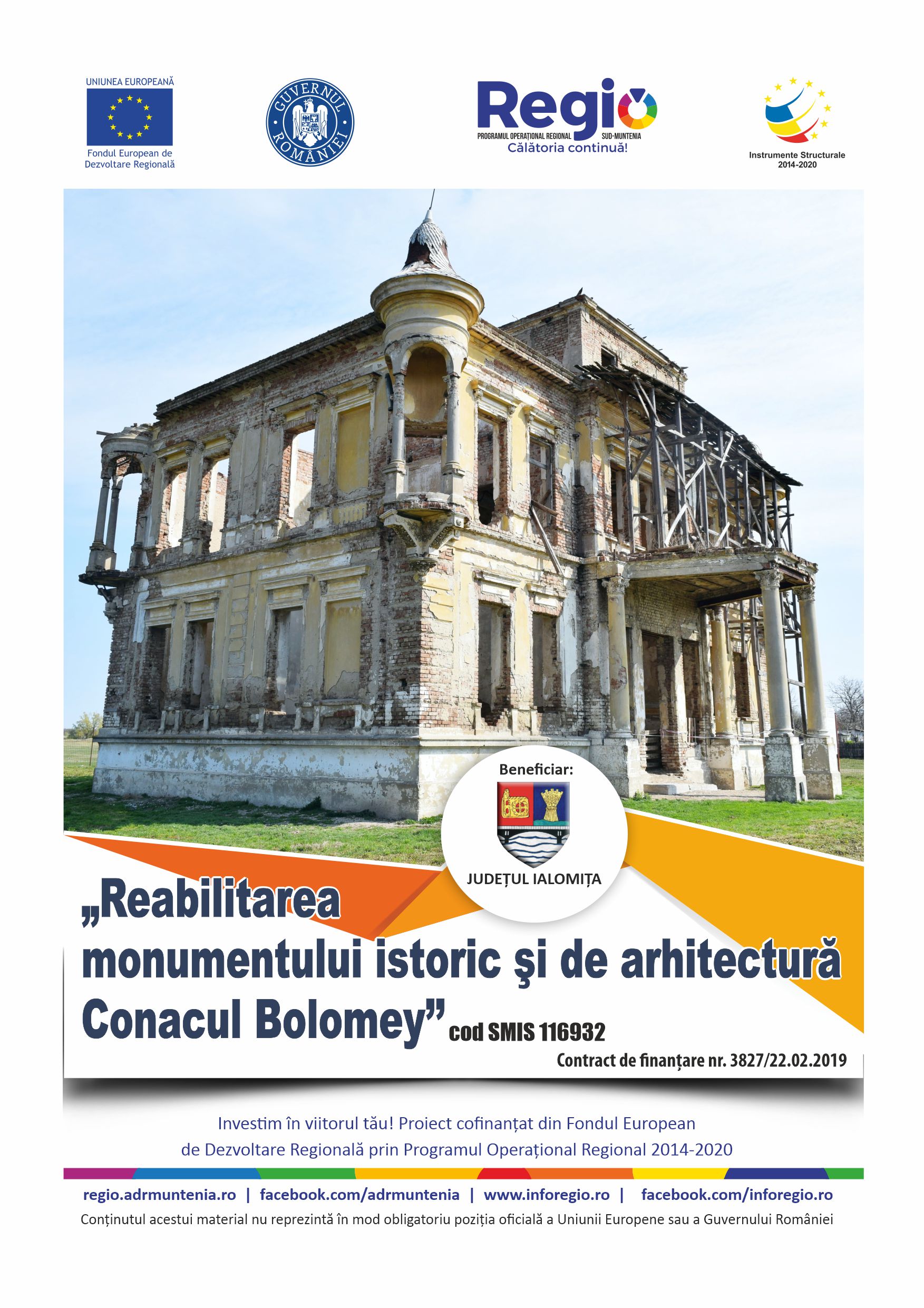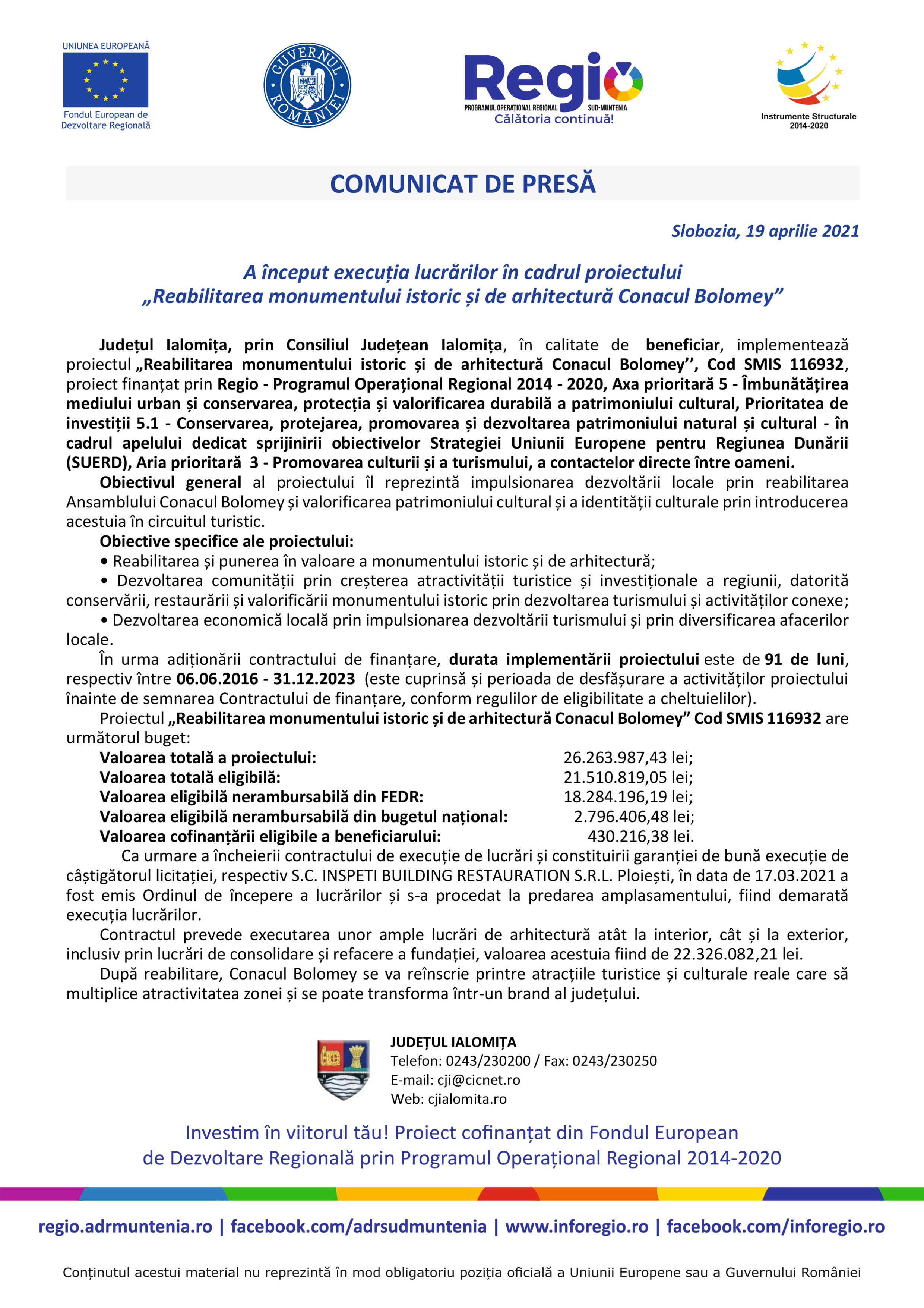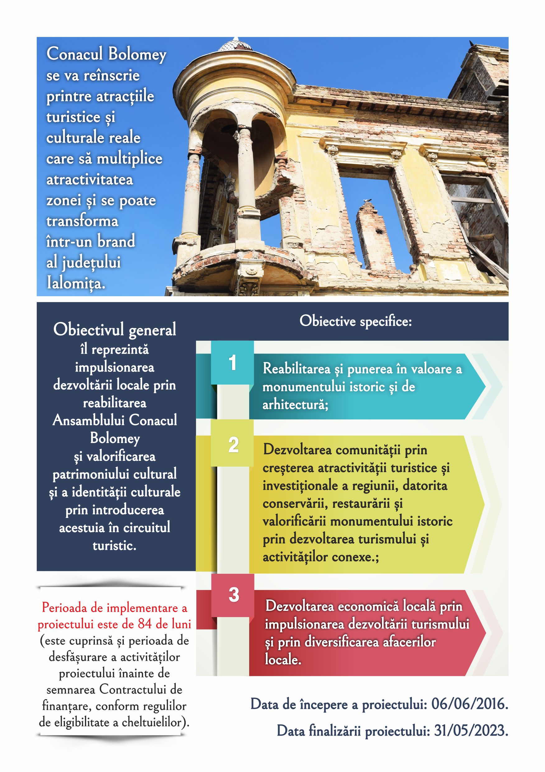 Astfel, în anul 2016, Consiliul Județean Ialomița a început demersurile în vederea obținerii de finanțare externă nerambursabilă din Fondul European de Dezvoltare Regională prin Programul Operațional Regional 2014-2020. În urma evaluării, proiectul a fost acceptat, iar în 2019 s-a semnat contractul de finanțare. Aproximativ un an a durat procedura de achiziție publică, iar începând de azi, Conacul Bolomey va intra oficial în reabilitare.