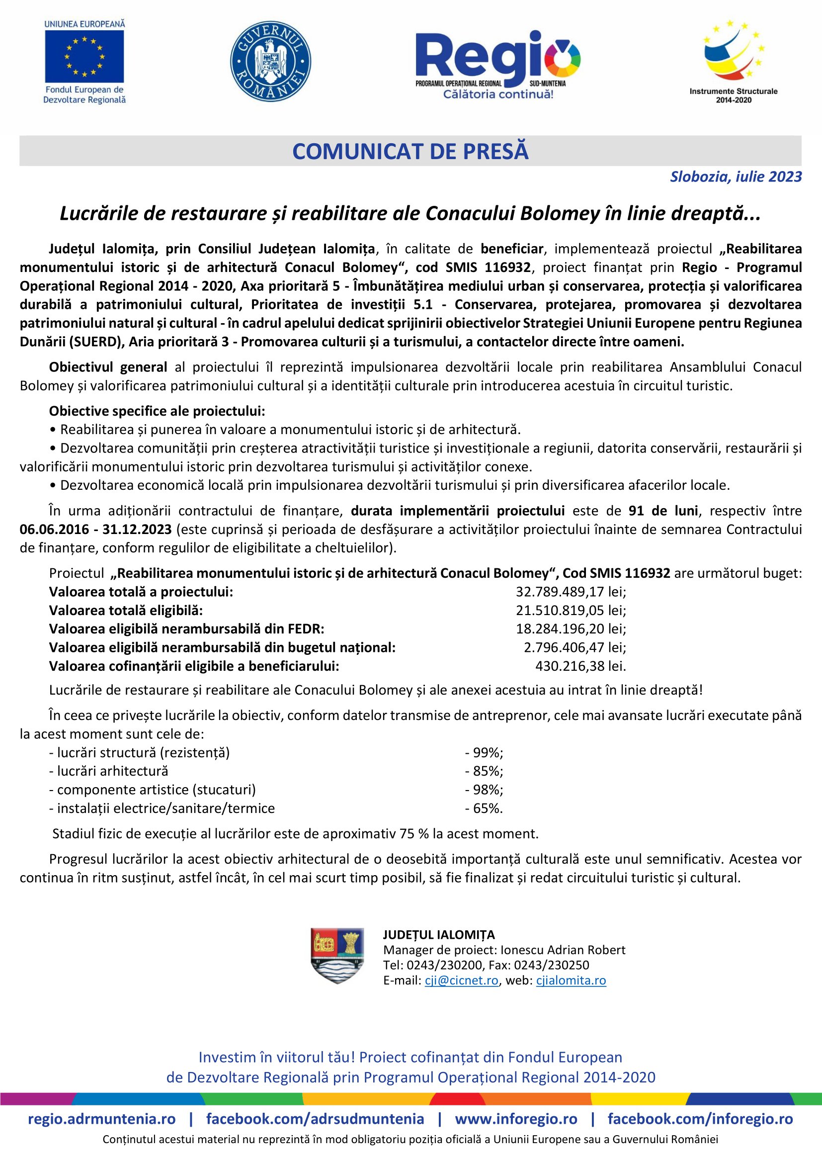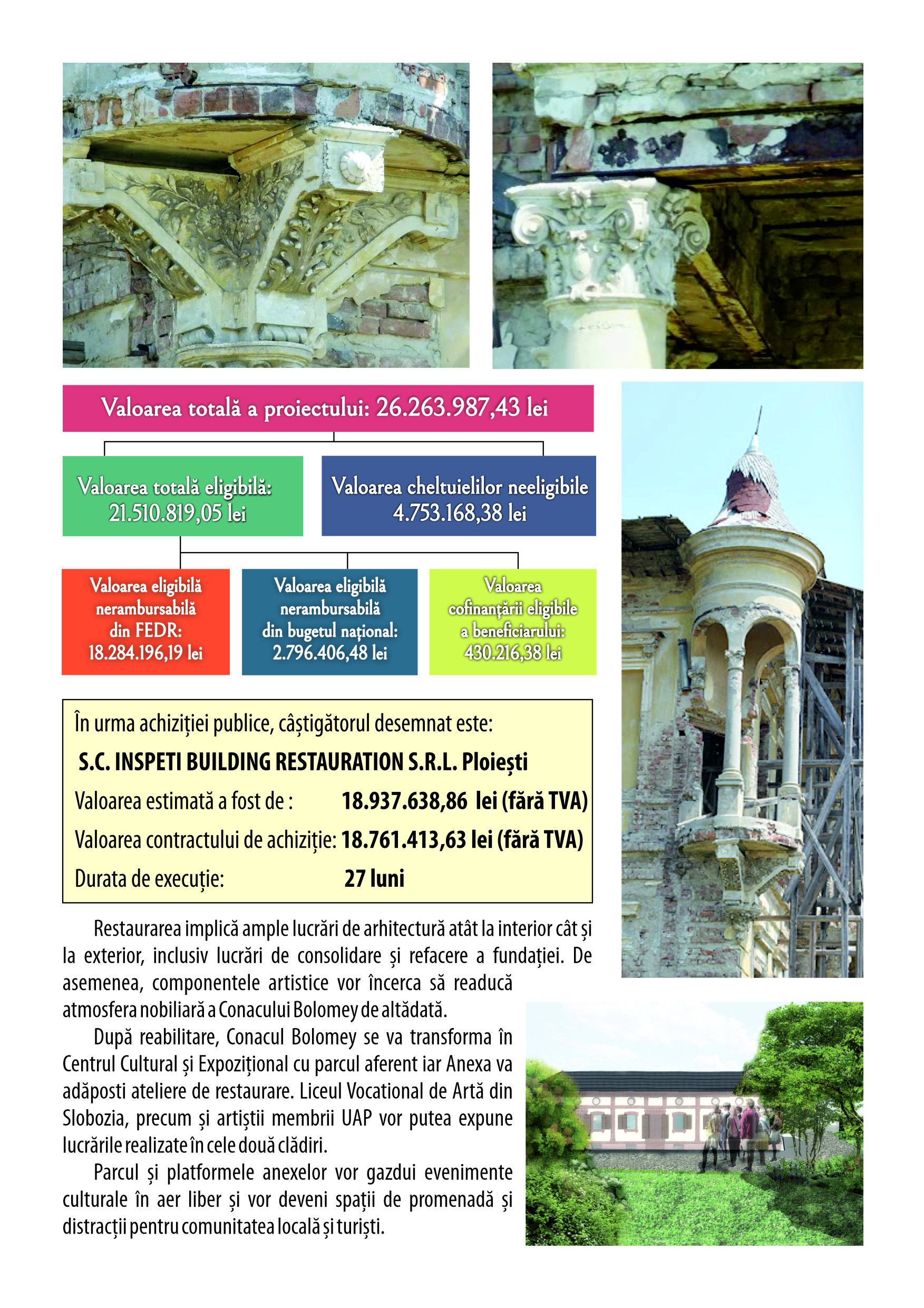 După finalizarea consolidării structurii la Conacul Bolomey și la anexa acestuia, s-au realizat tencuielile interioare și parțial cele exterioare, a fost montată tâmplăria la ambele obiective, demarându-se lucrările de montare a stucaturilor în camerele de la etaj și parterul conacului! De asemenea, s-au realizat o parte dintre lucrările de amenajare a parcului conacului ! Consiliul Județean Ialomița susține punerea în valoare a monumentelor istorice importante și promovarea turistică a județului nostru!